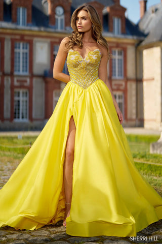 Make a sparkling statement in this strapless ballgown with a beaded bodice. The taffeta skirt includes a daring slit, perfect for dancing the night away in style!
