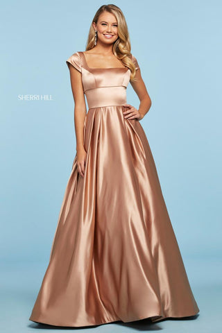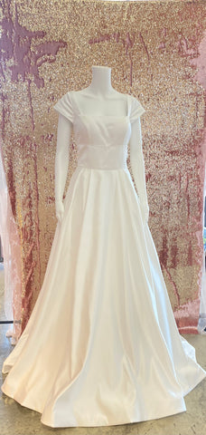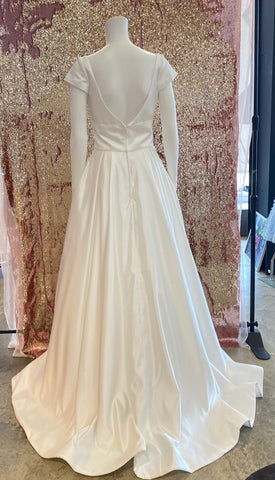 This gown gives you a well-defined waistline as it features a straight neckline, cap sleeves, seamed broad waistband and an open back. The A-line pleated skirt with a subtle sweep train adds extra appeal to this fit-and-flare gown.