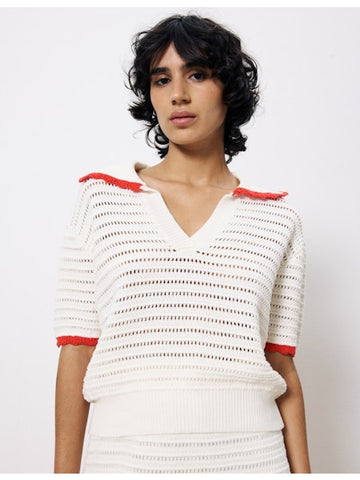 Breezy, bold, and effortlessly chic—the Sunset Sailor Top by FRNCH blends modern femininity with vintage nautical charm. Featuring a lightweight open-knit texture and playful poppy-red trim, this statement top is your go-to for everything from dockside brunches to city strolls.