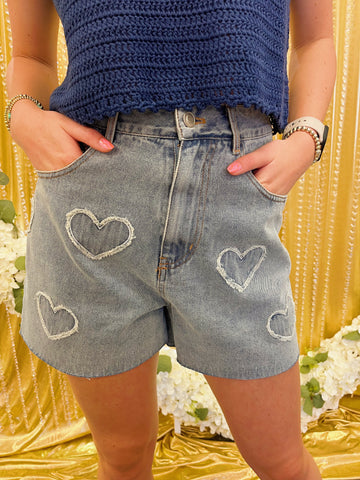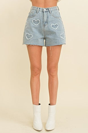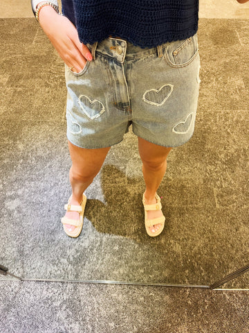 Fall in love with your denim all over again in the Sweetheart Stitch Shorts—a playful twist on the classic high-rise cutoffs. These light-wash denim shorts feature raw hems and adorable heart-shaped stitch detailing throughout, adding just the right touch of charm and personality. With a relaxed fit and flattering rise, they’re a sweet staple for sunny days and statement looks.