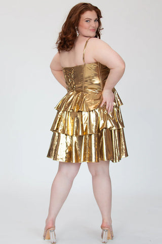 Bring the glamour in the Sydney’s Closet SC8161 Gold Metallic Dress, a dazzling plus-size party dress designed to make every entrance unforgettable. Crafted with a lustrous gold metallic fabric, this show-stopping dress features a ruched sweetheart bodice with delicate spaghetti straps that flatter your neckline and provide comfortable support.