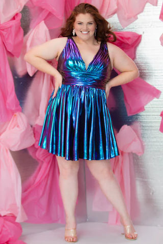 Make a bold entrance with this dazzling dress! Featuring a captivating color-shifting finish that reflects hues of blue, purple, and teal, this mini dress is designed to stand out and command attention at any event.