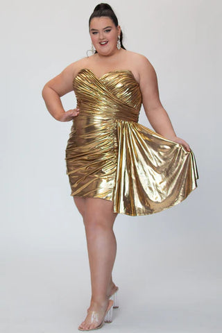 Shine brighter than ever in this radiant gold metallic mini dress! With its structured sweetheart neckline and figure-flattering ruching, this dress was designed to make a bold, unforgettable entrance.