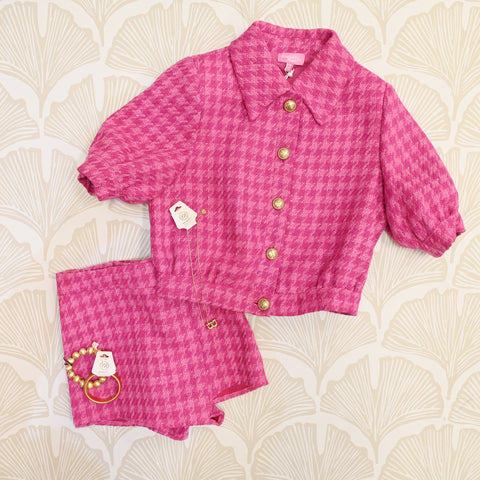 Whether you’re heading to brunch, a day of shopping, or a weekend getaway, this pink houndstooth skort is versatile, on-trend, and a must-have addition to your closet.