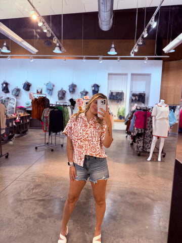 Introducing The Aphelie Shirt, a sophisticated and exclusive addition to your wardrobe. This printed button up shirt is elevated with a collared neckline, adding a touch of elevated elegance. Perfect for any occasion, this shirt combines artful design with timeless style. Elevate your look with The Aphelie Shirt.