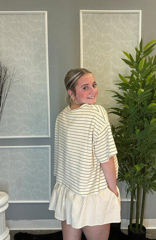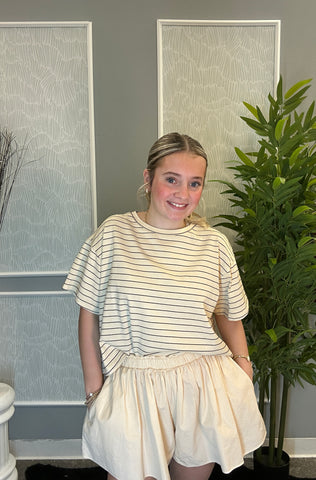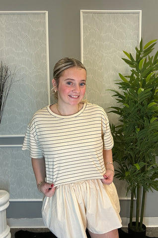 Coastal comfort meets everyday cool in the Cloudless Coast Set—a lightweight, laid-back two-piece made for sun-soaked days and salt-air strolls. This effortless set features an airy striped cropped tee with a relaxed fit and raw hem, perfectly paired with matching balloon shorts that blend comfort and style.