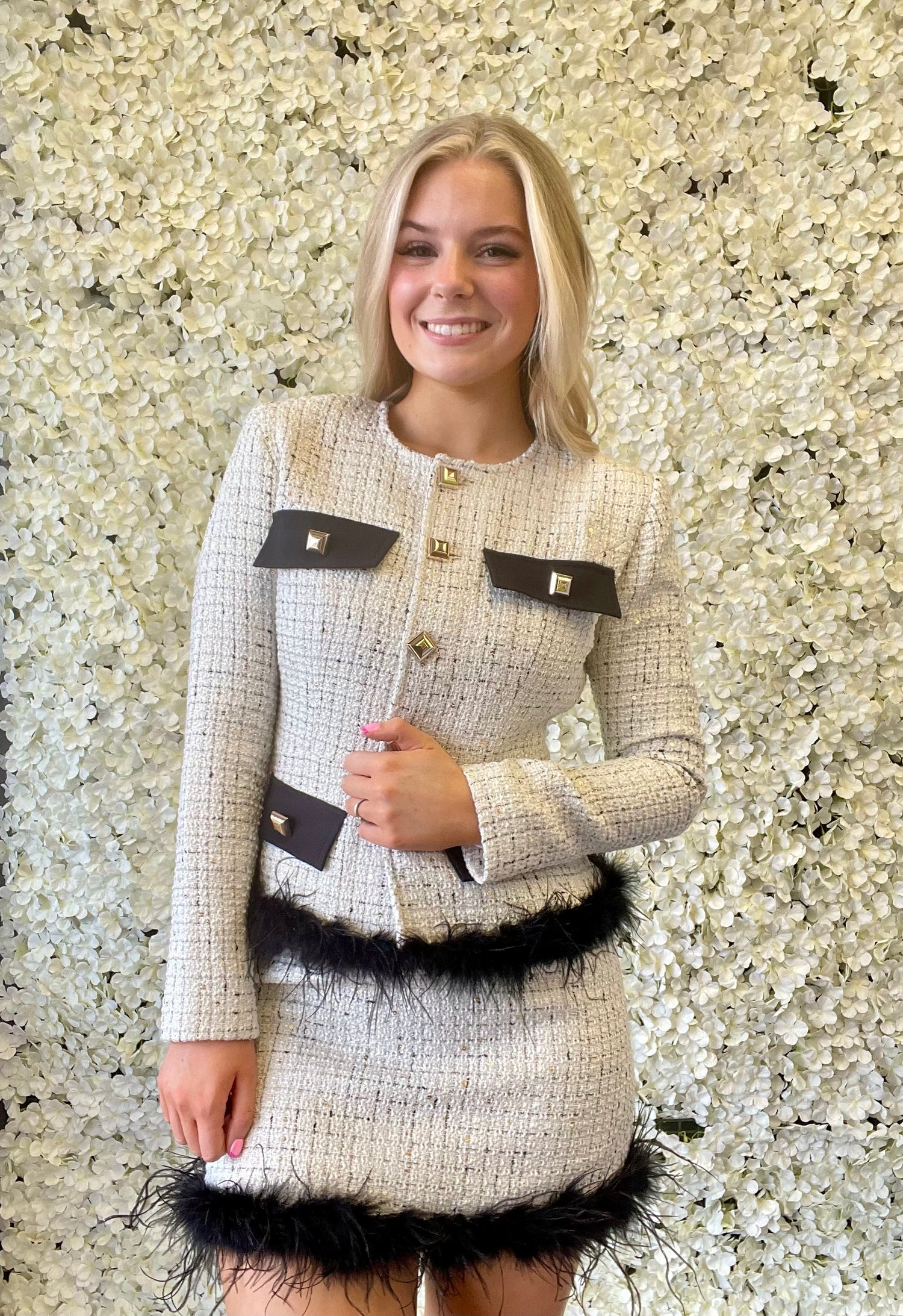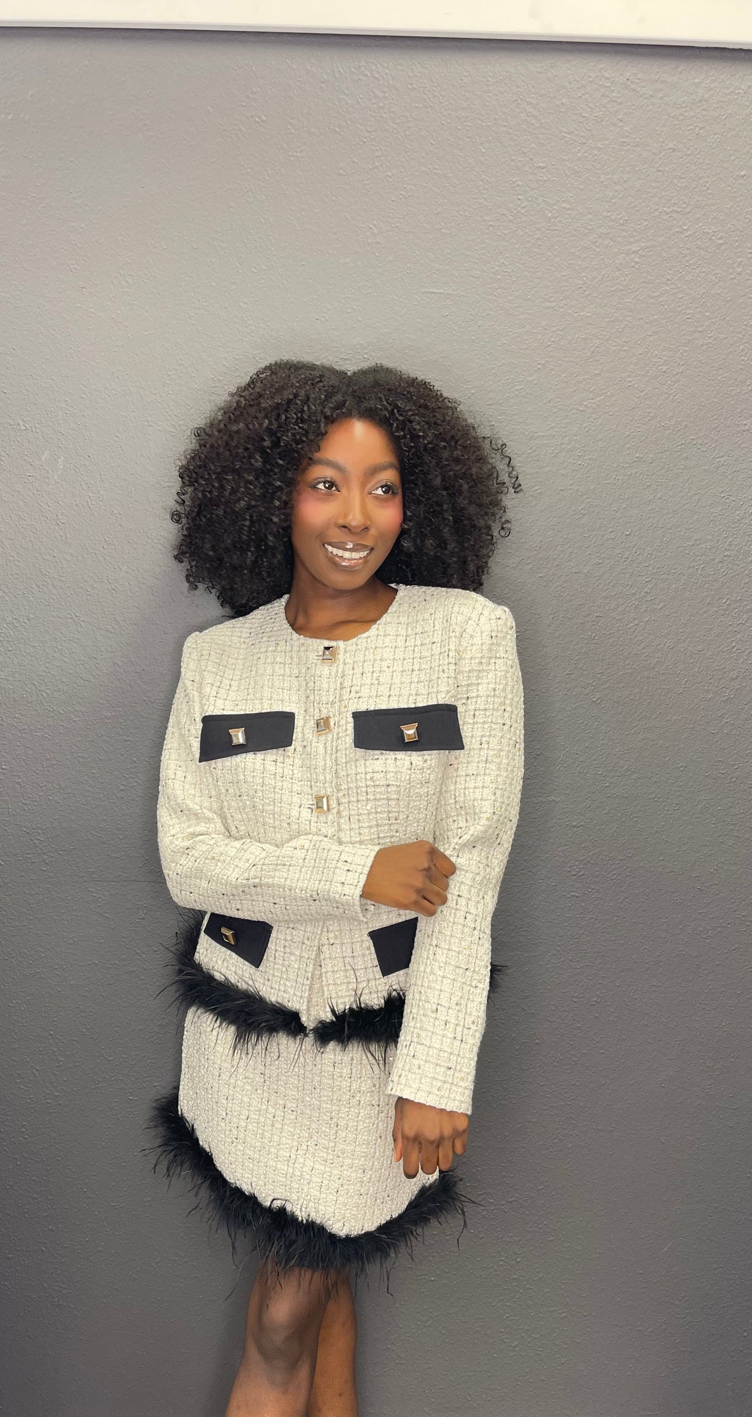 Elevate your style with our two-piece set featuring a cropped tweed jacket with gold buttons and black trim, paired with a flattering mini skirt with black feather trim. Made with high-quality tweed fabric, this set offers a tailored fit and a figure-flattering design. Perfect for any special occasion, it will make you look and feel your best.