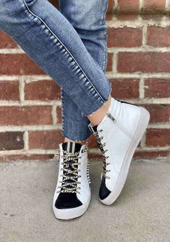 Step into the sassy style of The Star Tennis Shoe! These vegan leather high-tops come equipped with studded vintage stars, comfy padding, and a handy side zipper that makes them ultra-easy to slide on and off. They'll be your go-to on days when you want to shine! Rock 'em and roll!