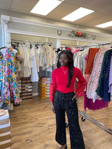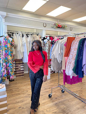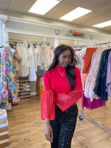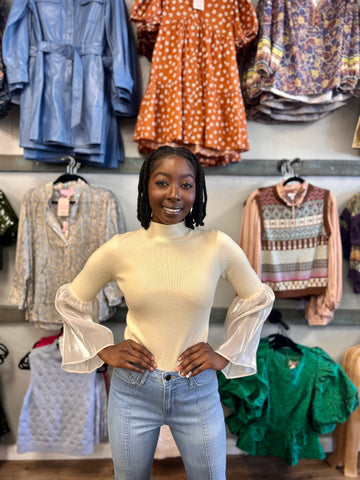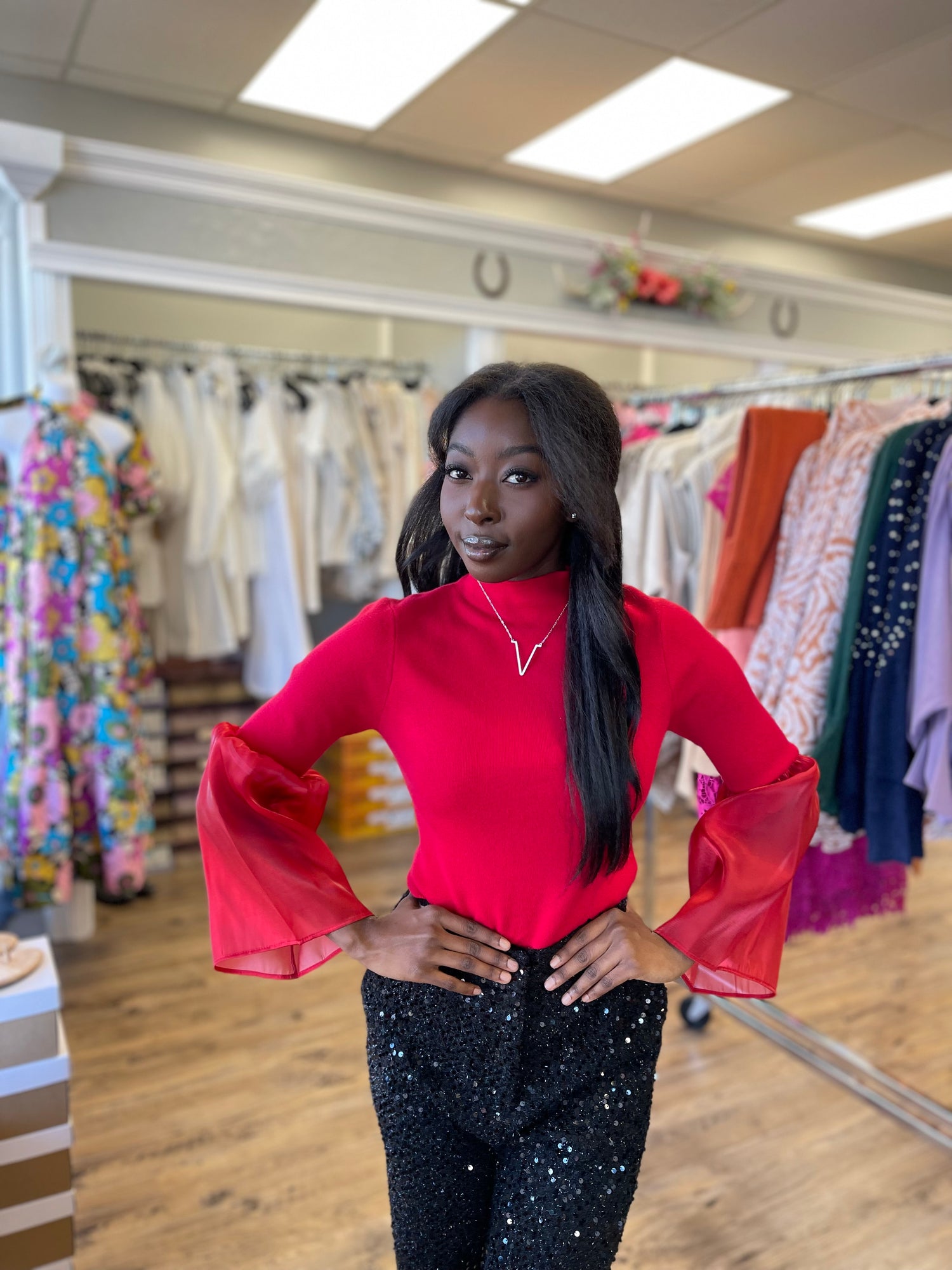 Make an elegant statement with The Stanley Top, a must-have blouse that blends classic style with eye-catching flair. Designed with a sleek mock neck and a fitted silhouette, this top takes a chic turn with its standout feature—dramatic organza bell sleeves that add instant sophistication and movement. Whether you’re heading to brunch, the office, or date night, this top transitions beautifully across seasons and occasions.