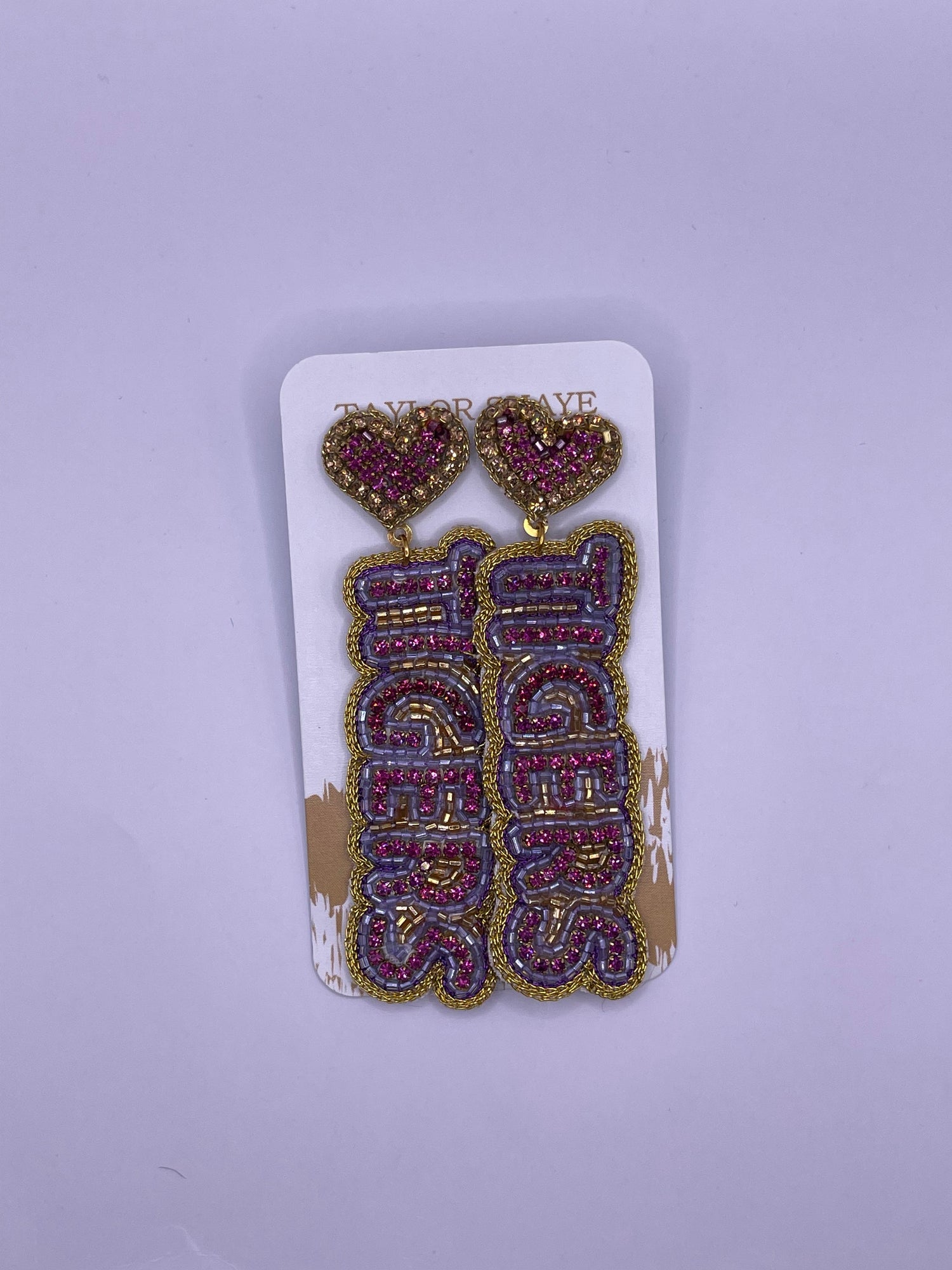 Add a touch of whimsy to your look and make a statement with these gorgeous Taylor Shaye Tiger Love Drop Earrings. Featuring a gold and pink heart at the top, with the word 'Tigers' delicately dangled beneath, these earrings are sure to be a conversation starter.