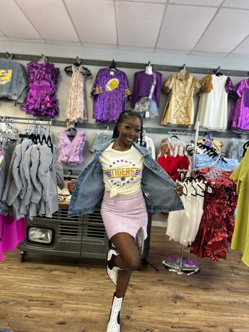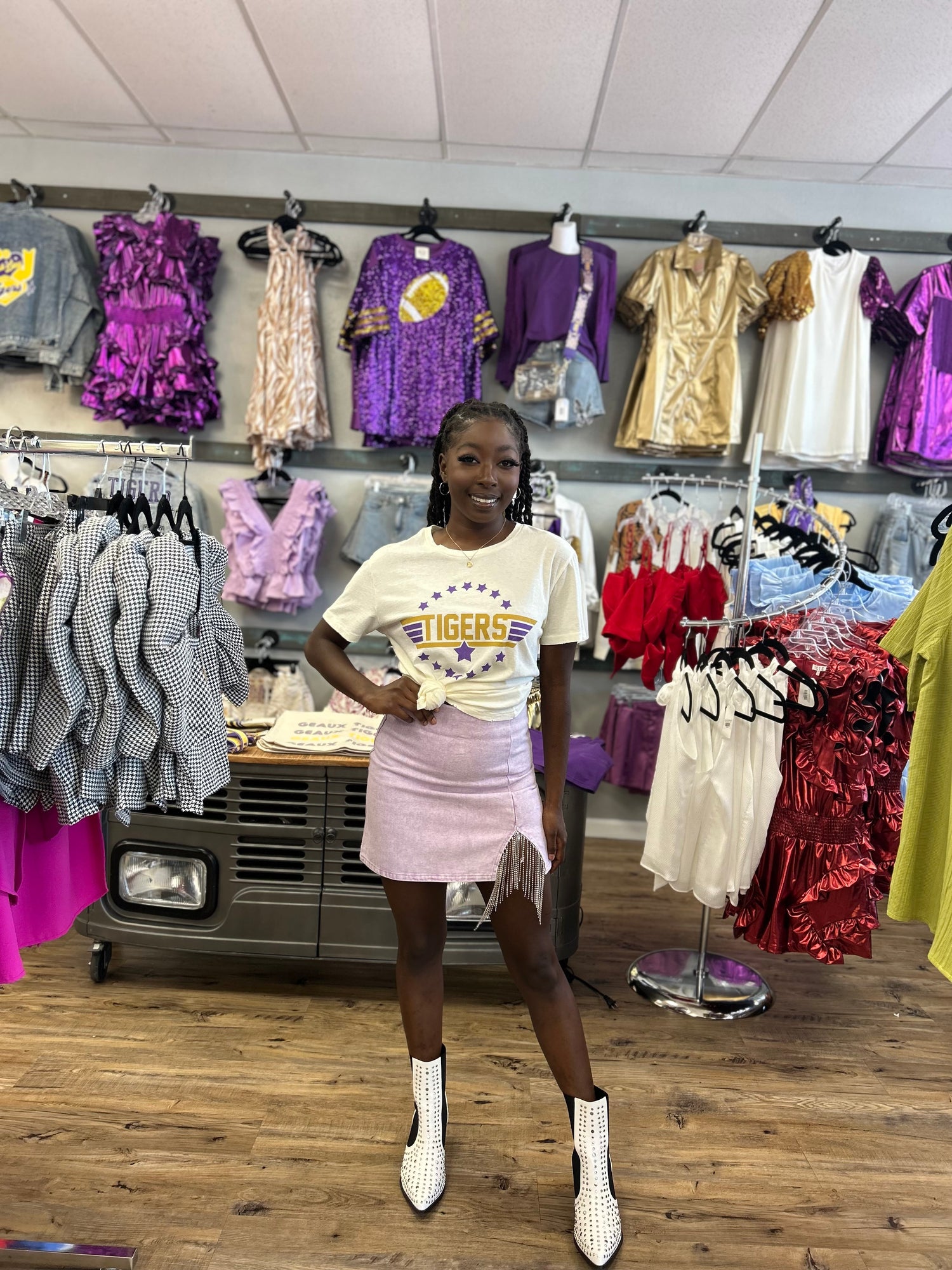 Cheer loud and proud in the Tigers Special Teams Tee—your new go-to graphic tee for spirited game days and tailgate style. Featuring a bold TIGERS print with retro stripes and pops of purple and gold stars, this soft cream tee brings vintage vibes with modern flair. Whether you're rallying in the stands or celebrating with friends, this shirt scores major style points.