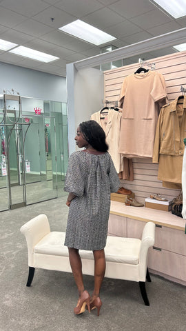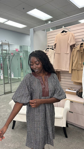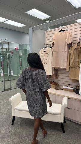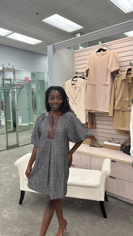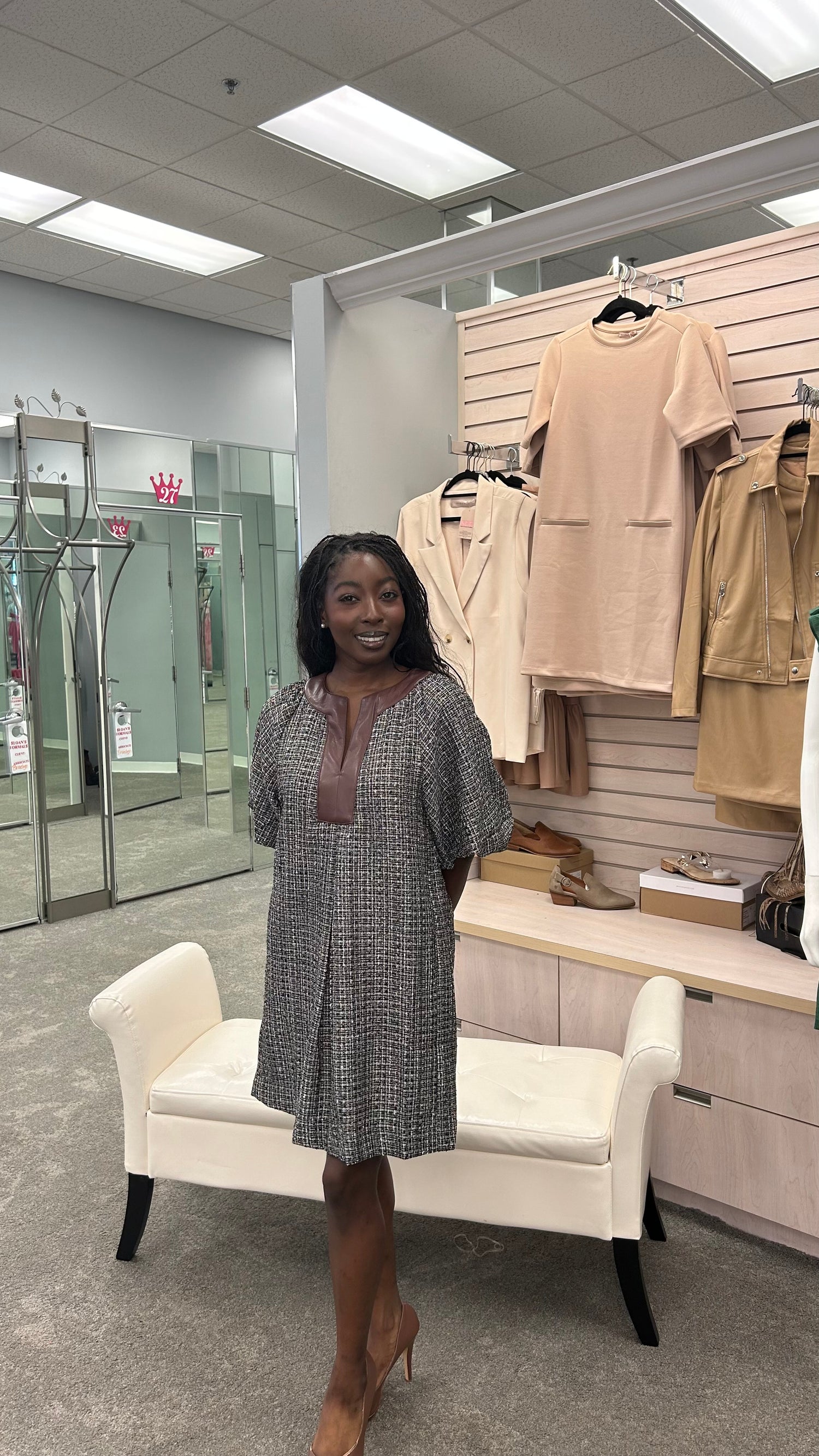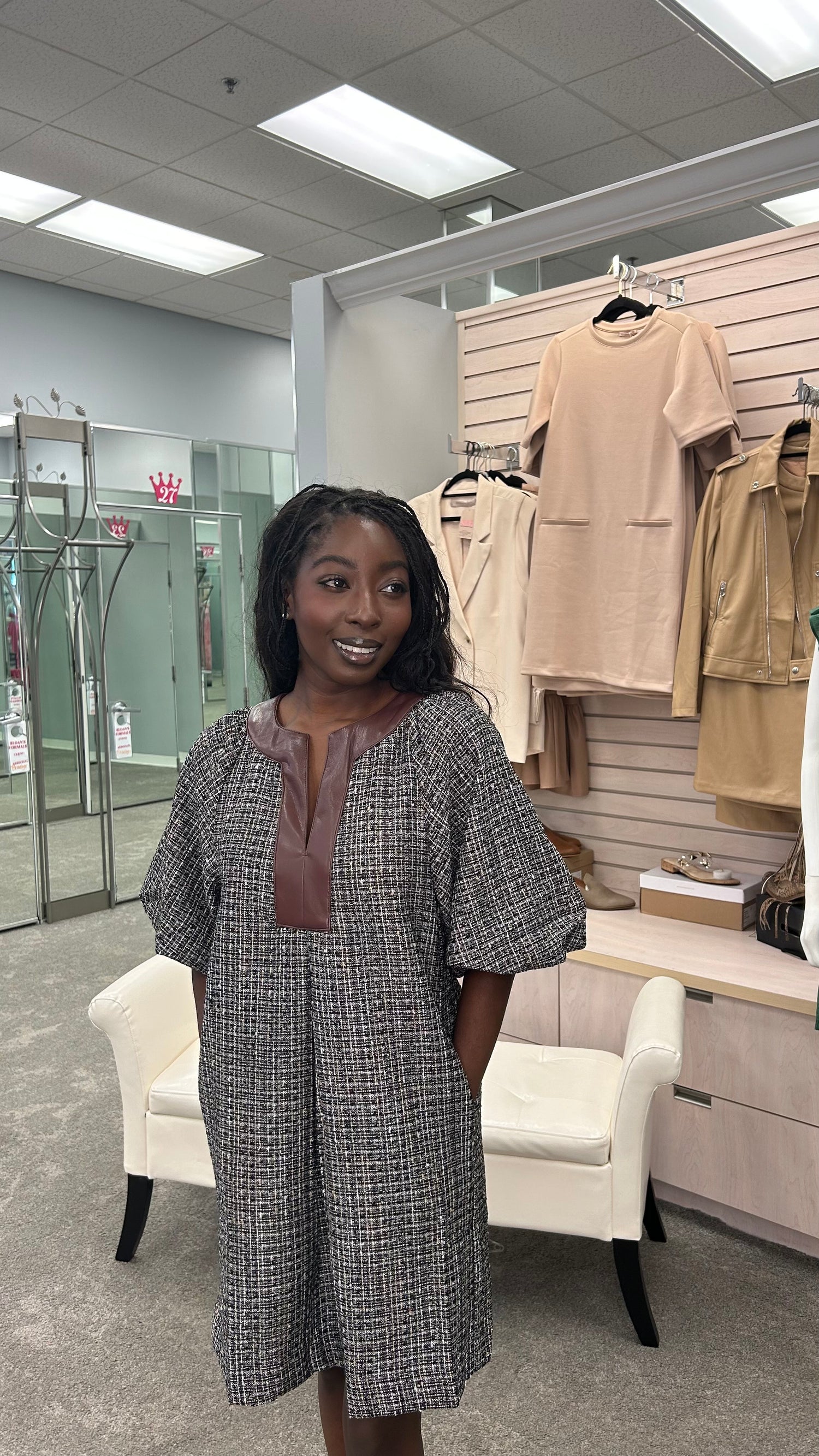 Indulge in the luxurious feel of our Into The City Dress, with its tweed fabric and leather trim. Perfect for a day downtown or a night out, this dress combines sophistication and comfort to help you make a statement. Elevate your style with this chic and versatile piece.