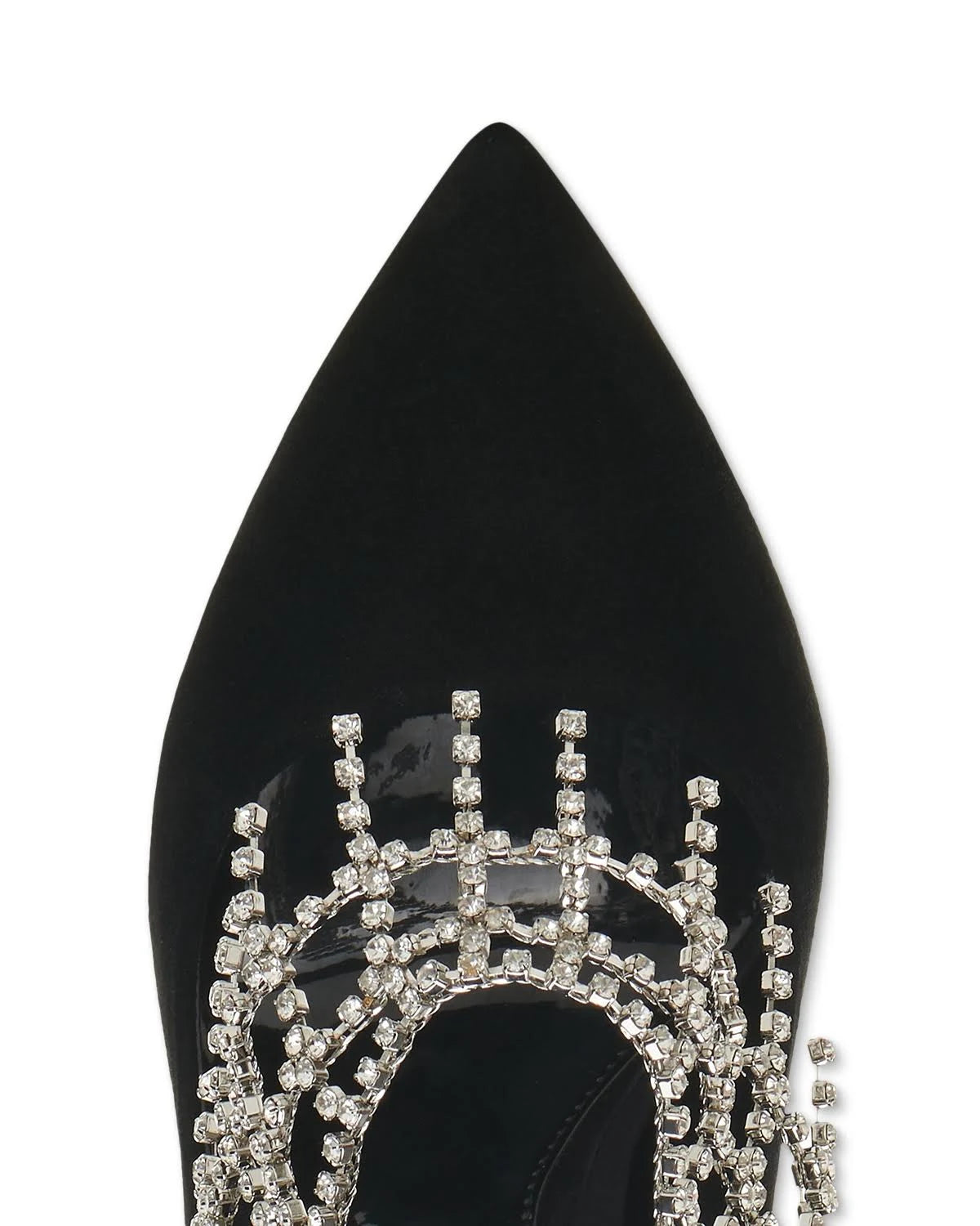 - Point toe; draped rhinestone “jewelry”; covered stiletto heel