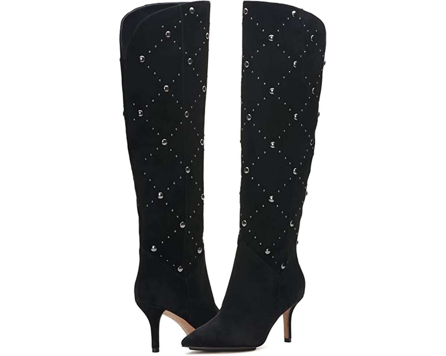- Point toe; curved topline; dome stud embellishment; tapered covered heel