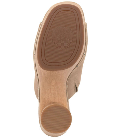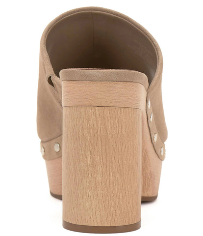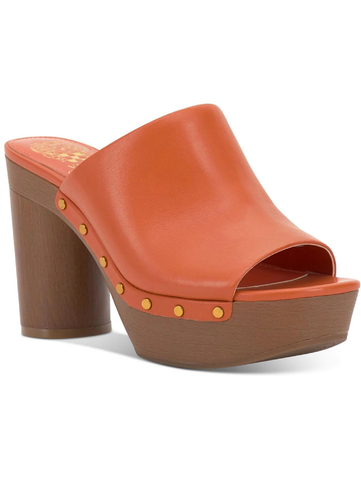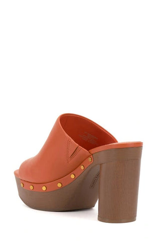 - Peep toe; flat-top stud detail; faux wood platform and heel