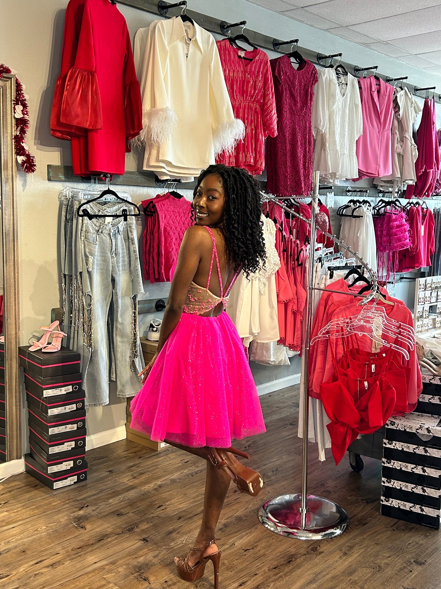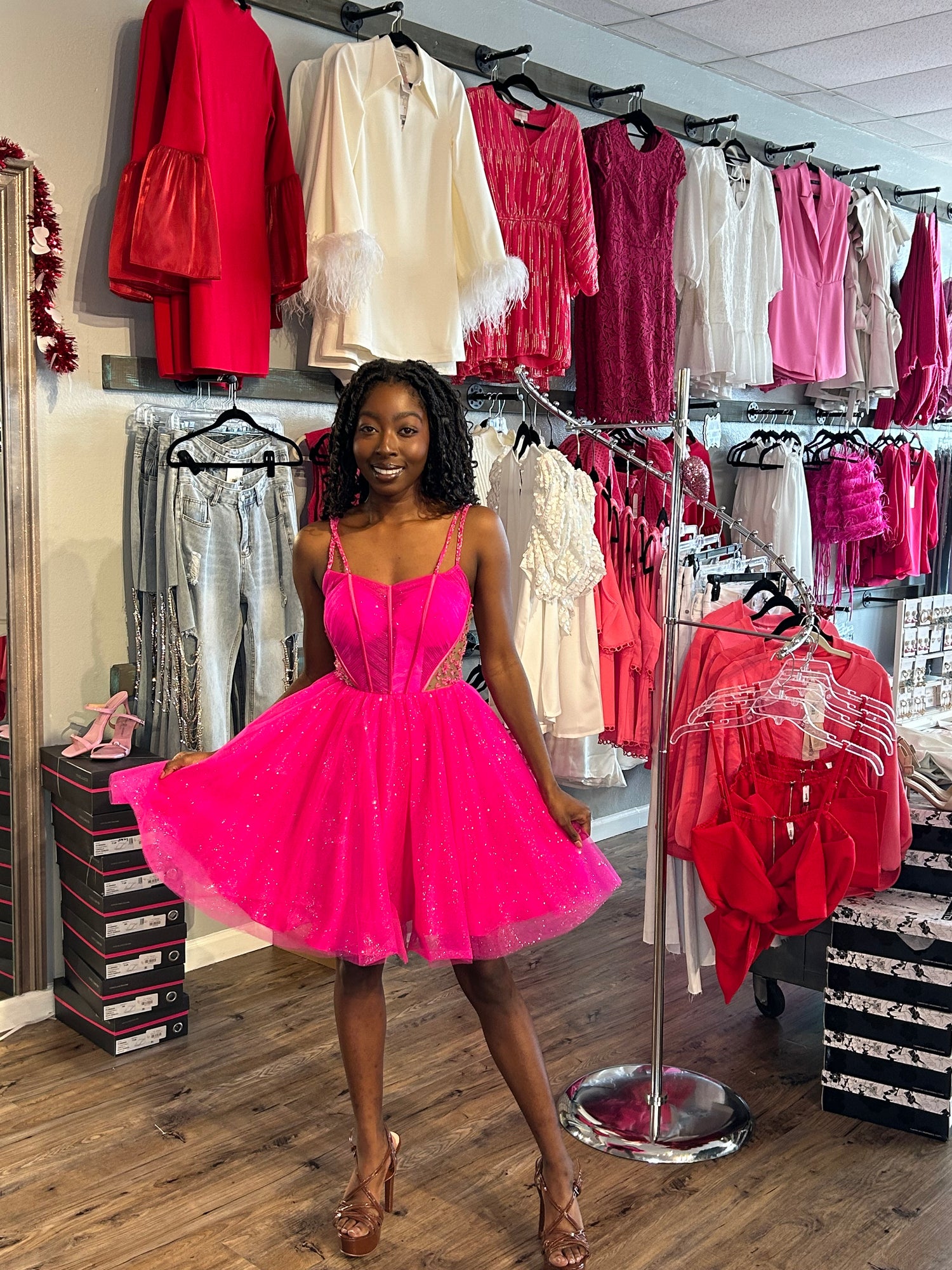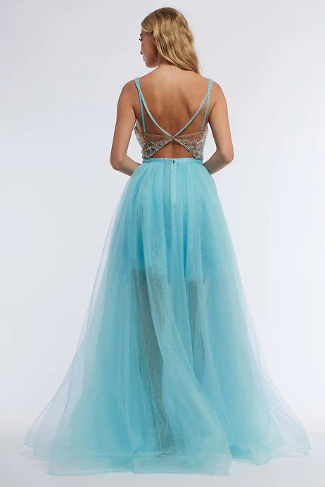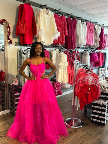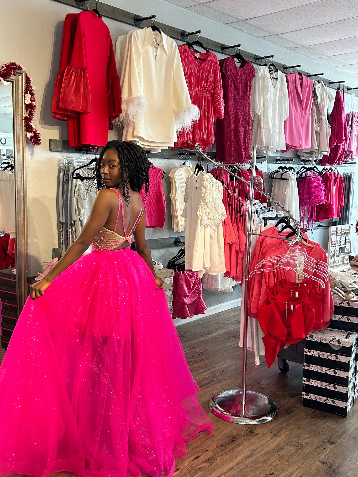 Experience the ethereal beauty of the Vienna 7879 dress. This stunning fuchsia cocktail dress features delicate tulle fabric and a long overskirt, creating a whimsical and romantic look. Elevate your wardrobe with this versatile and unique piece.