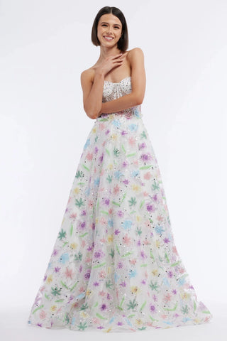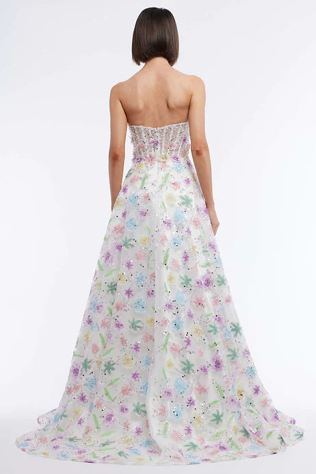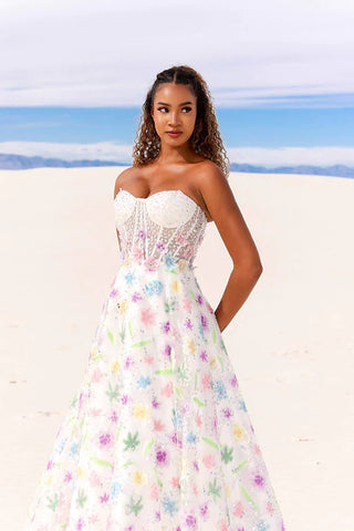 Experience elegance and grace with Vienna 7889. The strapless corset bodice highlights your figure while delicate floral appliques and rhinestone detailing add a touch of charm. The a-line silhouette offers a flattering fit for any occasion. Elevate your style with Vienna 7889.