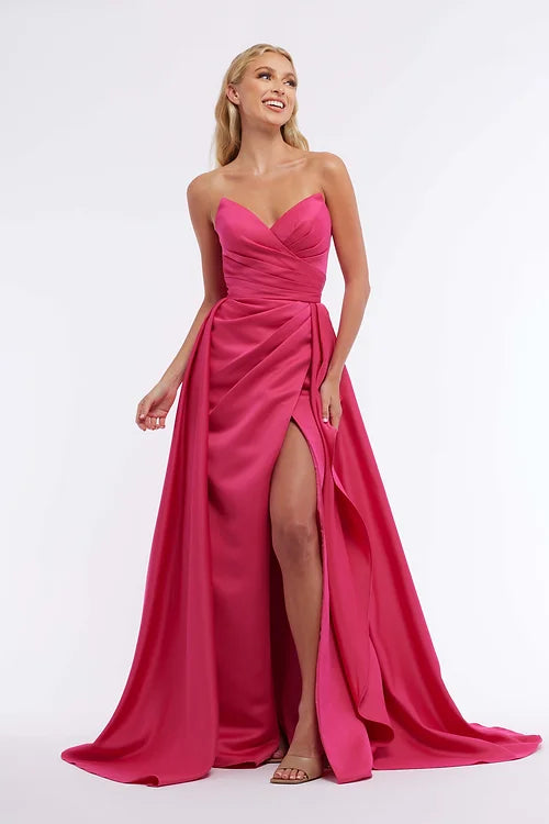 Be the belle of the ball in our Vienna 7898 gown! The fuchsia strapless fit and flare design will accentuate your curves, while the overskirt adds a touch of elegance. Stand out in this stunning gown at your next special occasion.
