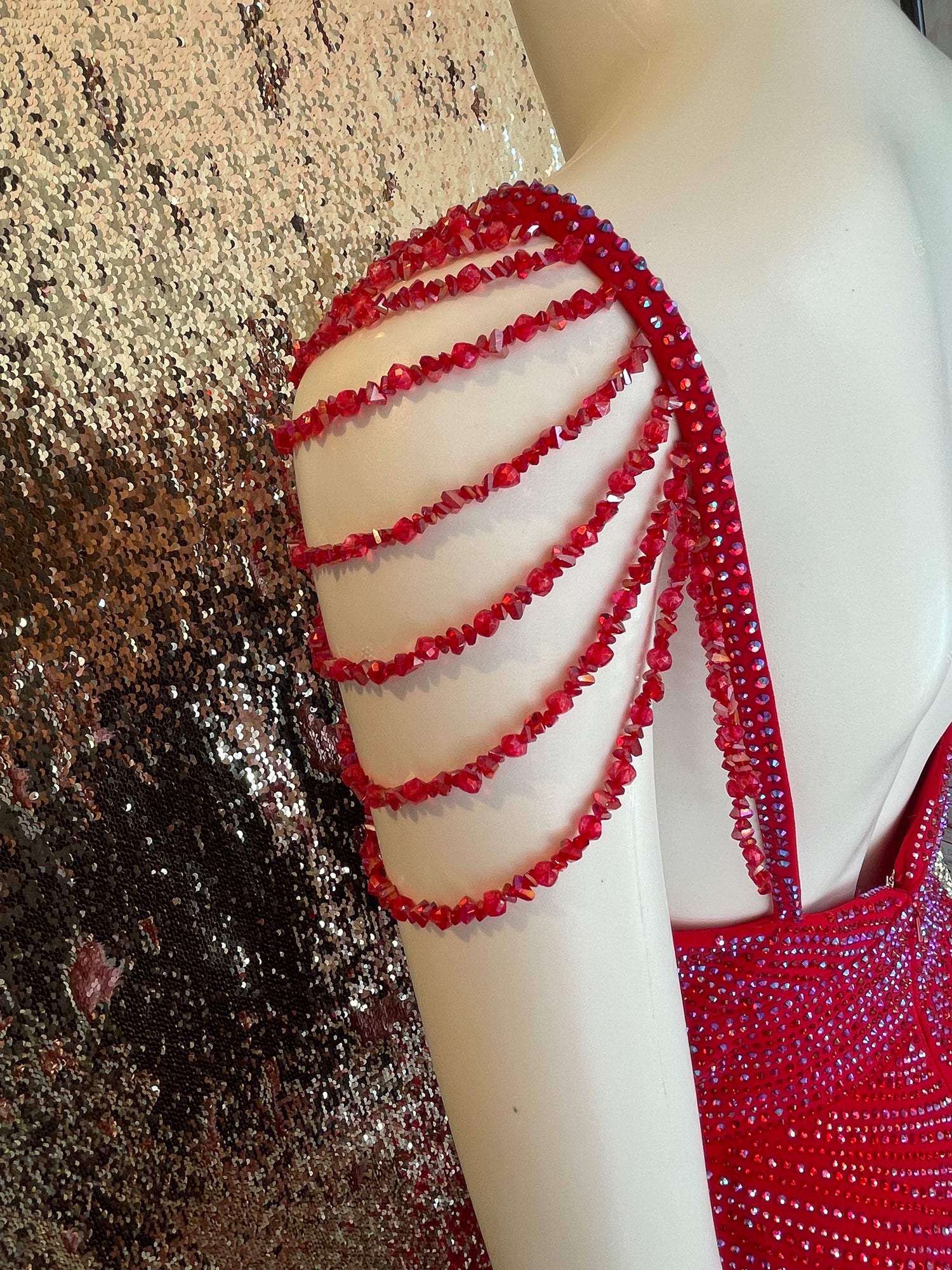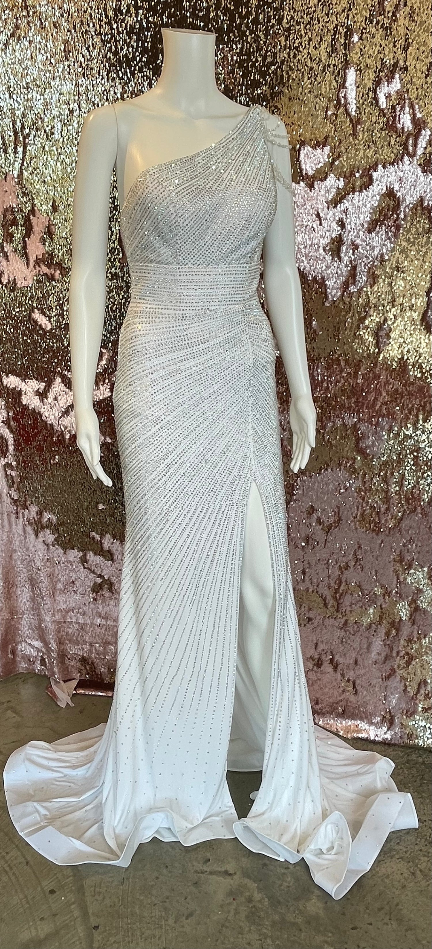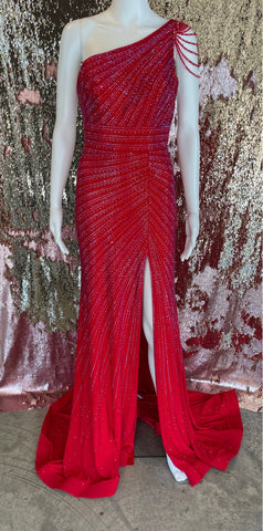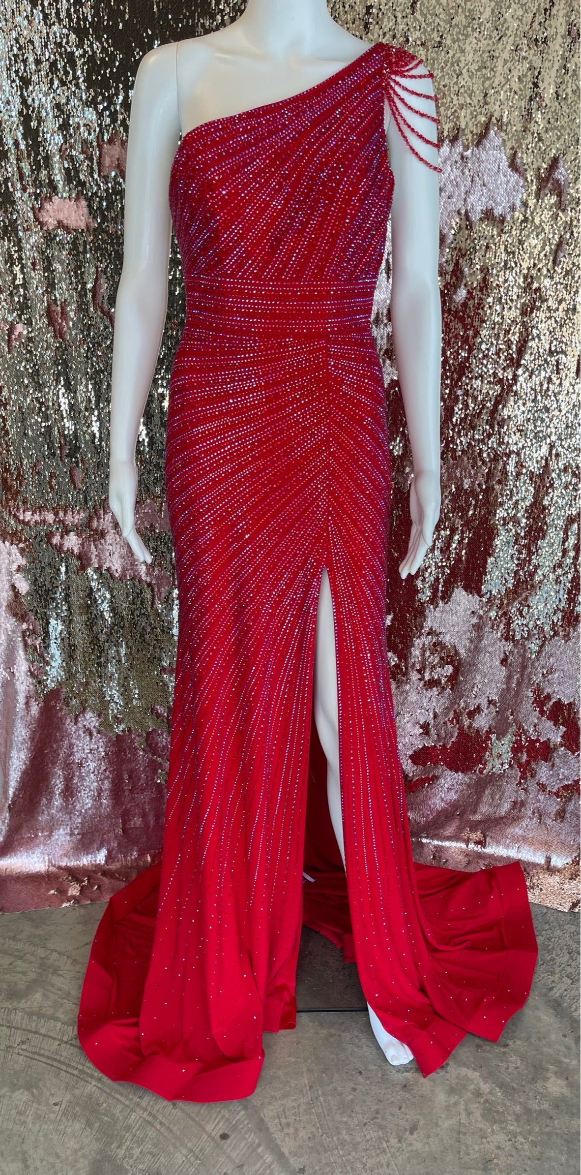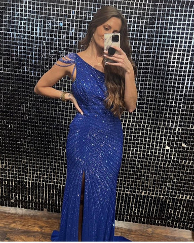 Make a statement in this elegant and chic Vienna 7945 dress. Featuring long form-fitting silhouette, stunning rhinestone detailing, and an eye-catching one shoulder with off the shoulder fringe detailing, you're sure to shine in this showstopper of a dress.