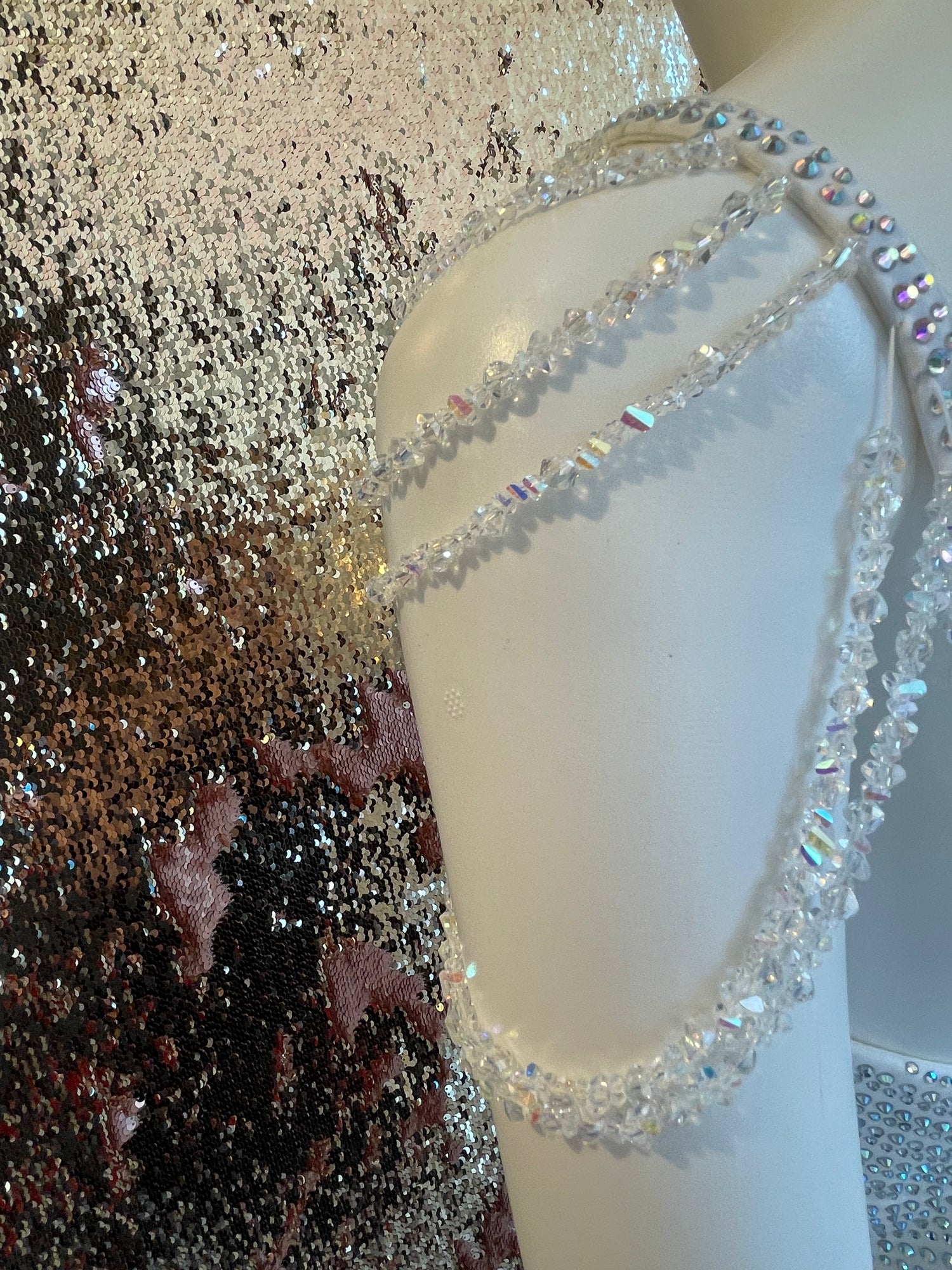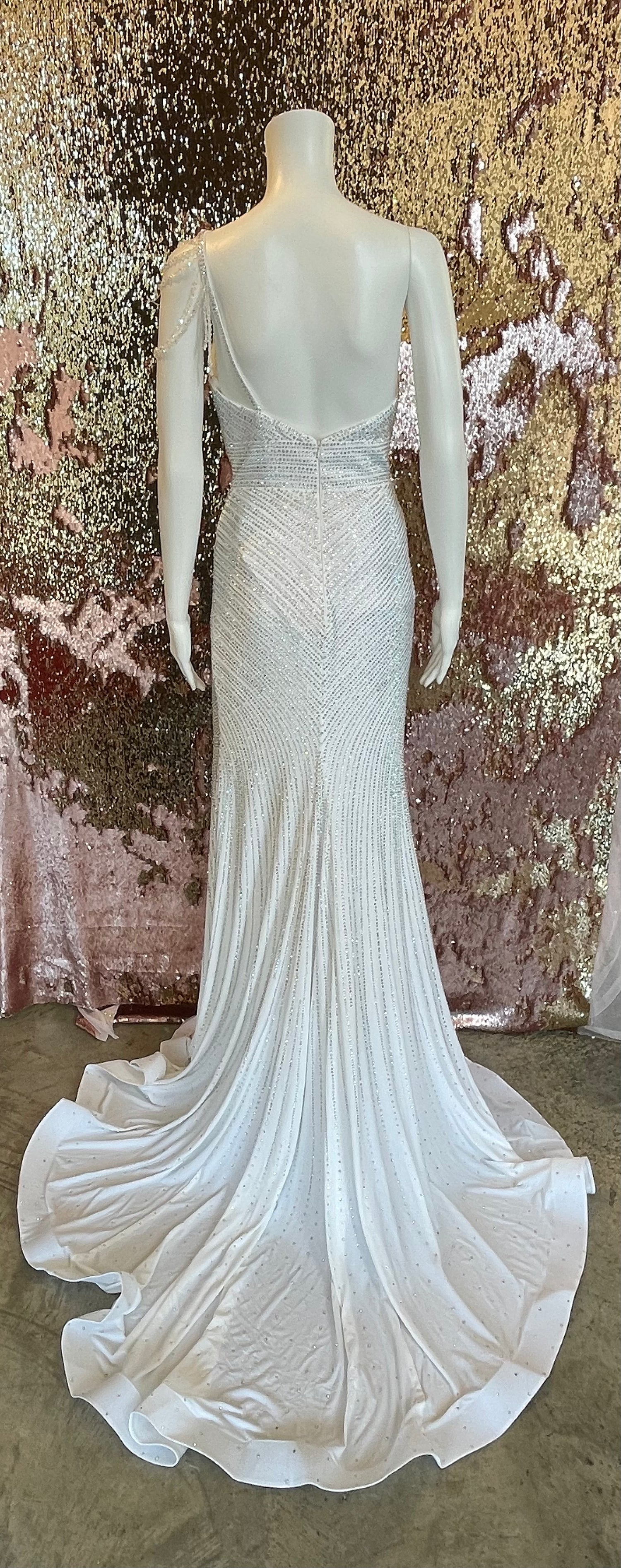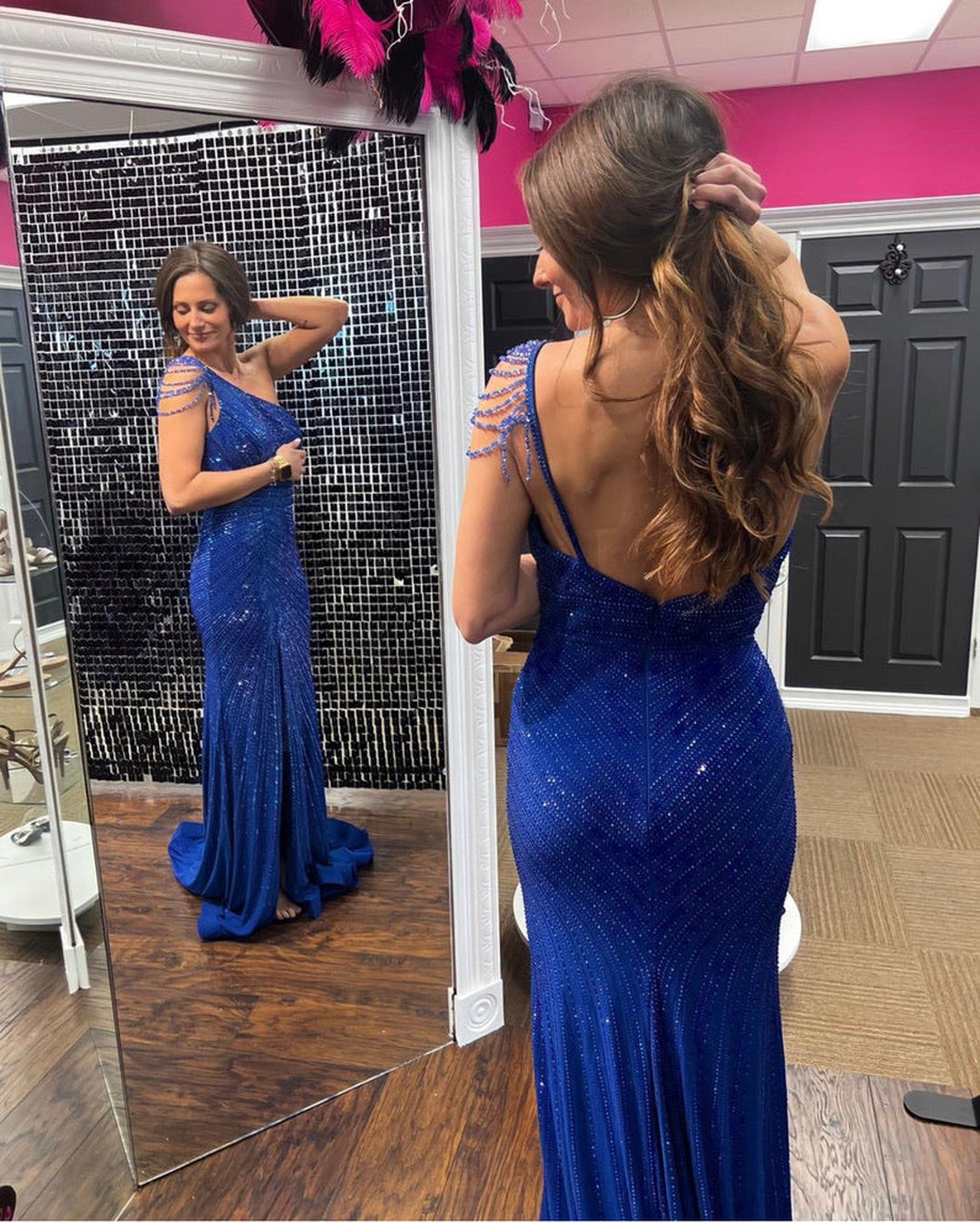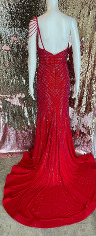 Make a statement in this elegant and chic Vienna 7945 dress. Featuring long form-fitting silhouette, stunning rhinestone detailing, and an eye-catching one shoulder with off the shoulder fringe detailing, you're sure to shine in this showstopper of a dress.