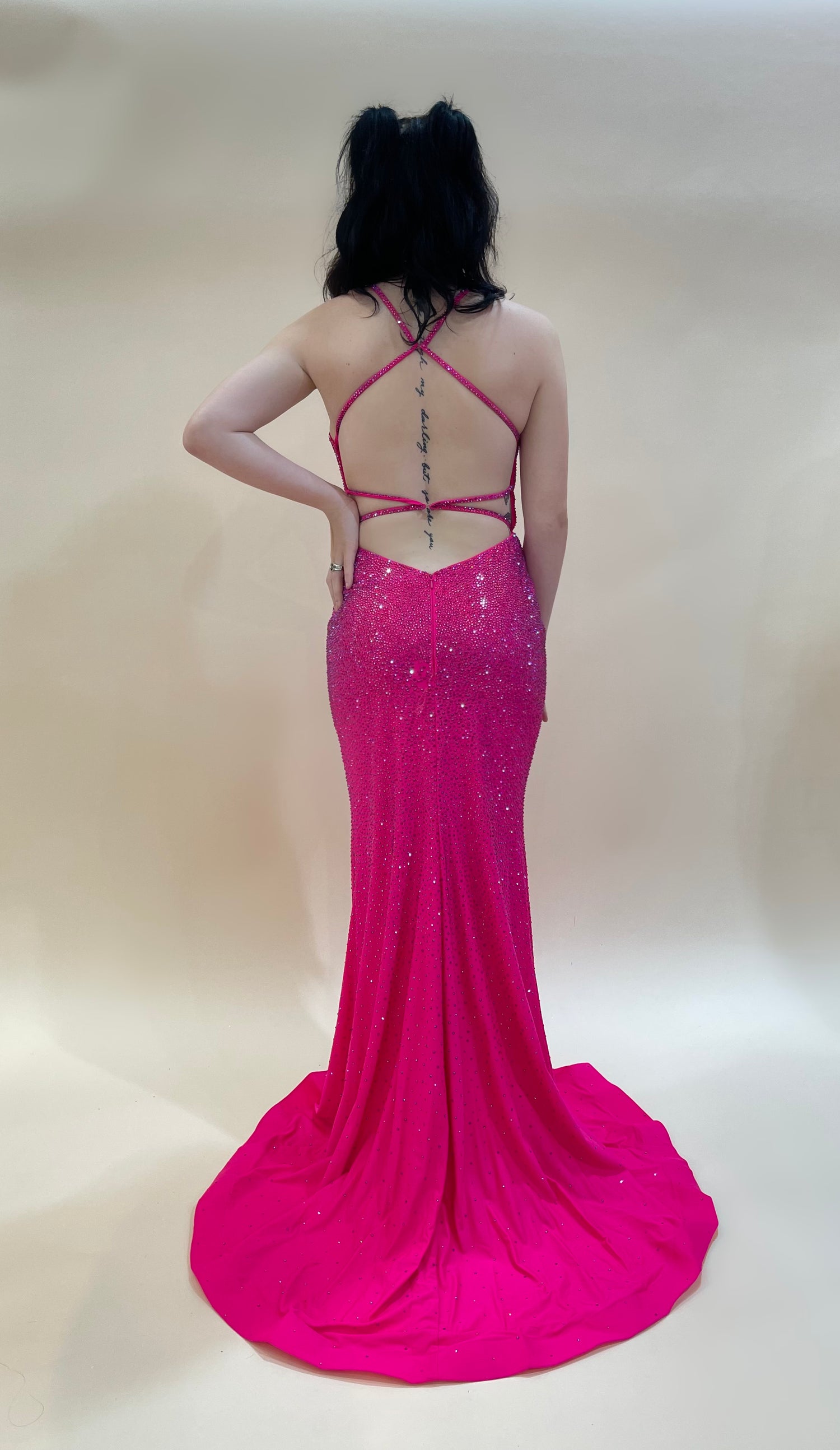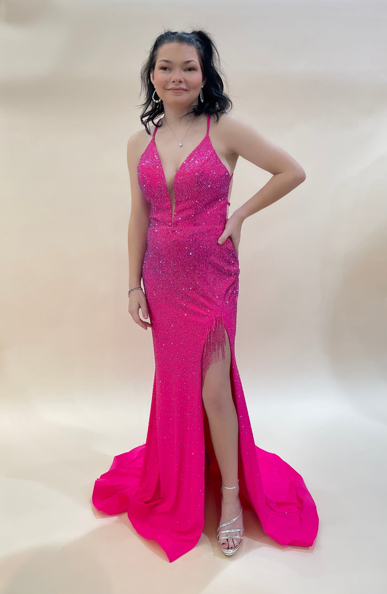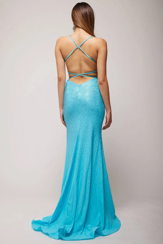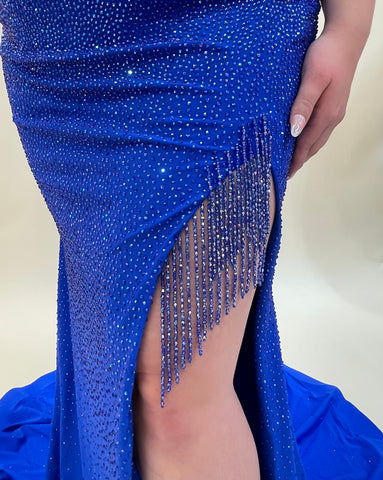 Glam up any event with the breathtaking Vienna 7952. This exquisite satin gown is adorned with twinkling stones for a touch of sparkle, and features a dramatic high slit detailed with alluring fringe. Elevate your look with a touch of luxury.