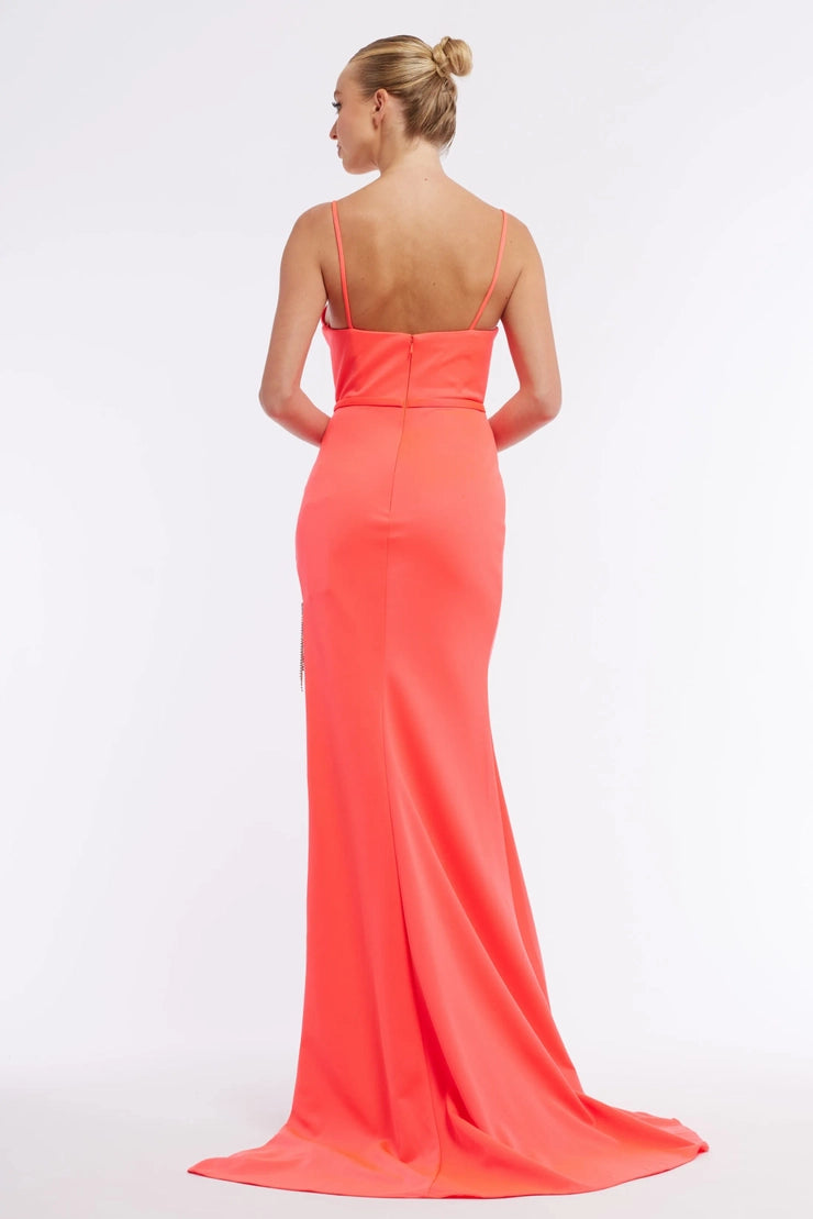 Step into the spotlight with Vienna 7975! This long dress features a sultry v neck and daring slit, perfect for turning heads at any event. With delicate spaghetti straps and a figure-flattering silhouette, you'll feel confident and chic all night long.