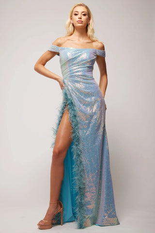 The Vienna 8859 is an unforgettable evening dress, designed with opulence in mind. Its fully sequin construction embodies grandeur and allure, while a high, feather-lined slit adds an alluring touch. Its off-the-shoulder neckline gives it a timeless silhouette, and a zipper back allows for comfortable and secure wear. An unparalleled piece of couture for special occasions.