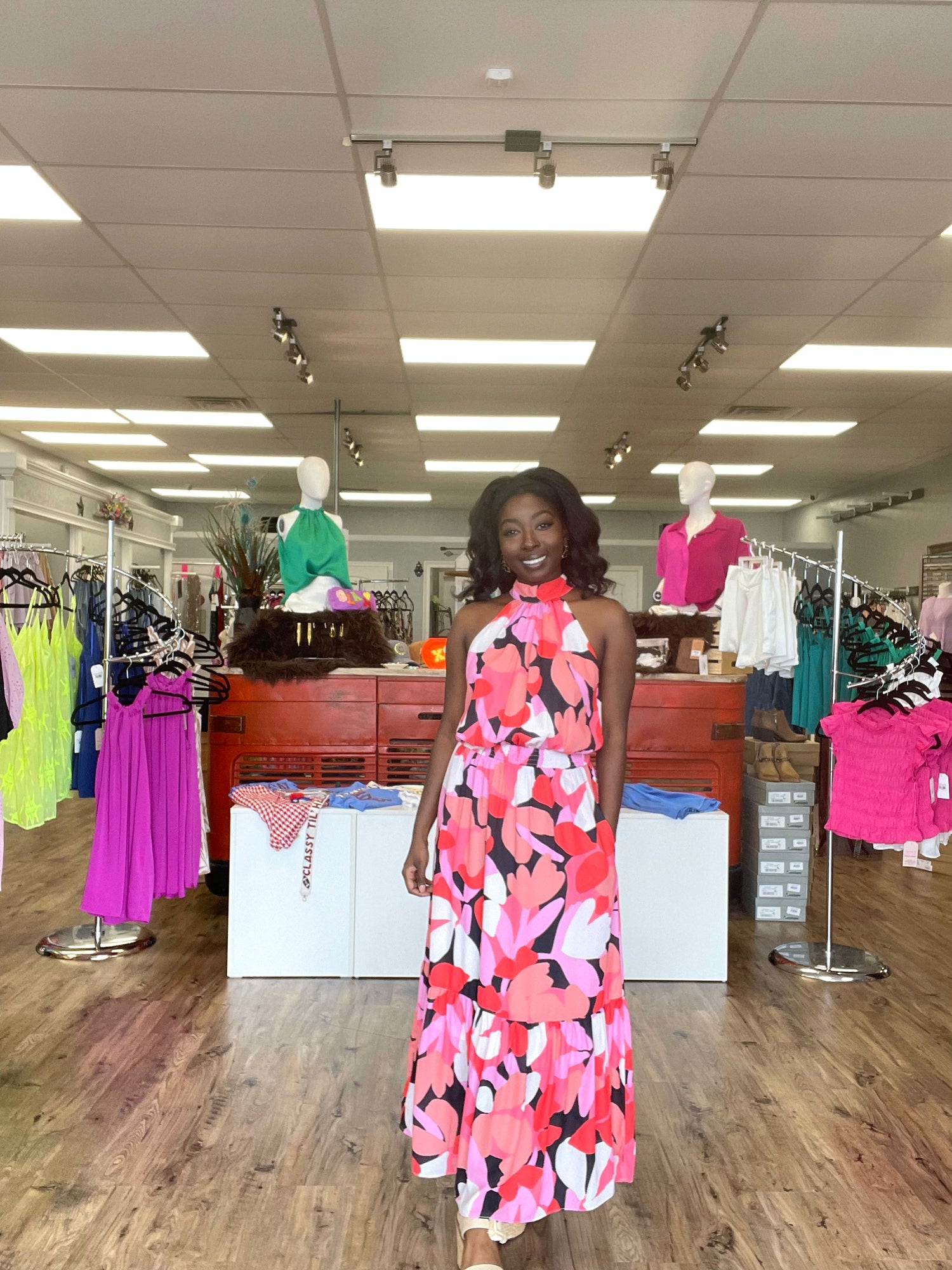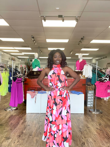 Watching the sunset dress is perfect for your summer vacation. A flowy maxi dress with a flattering halter top and full skirt, that makes you feel like you're in paradise. The all-over floral print makes a delicate statement, while the elastic waist helps make sure it sits just right. Wear with wedges or sandals on your next trip to escape.