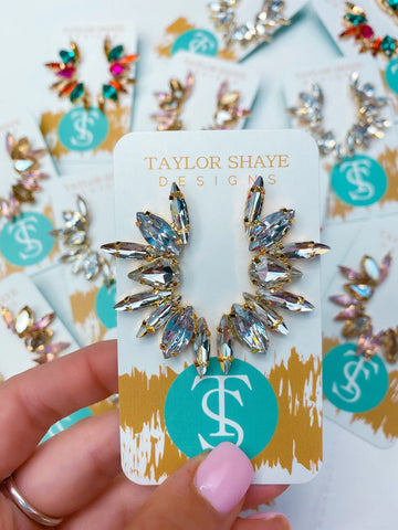 Turn every head in the room with the stunning Wren Drops—a bold yet elegant statement earring designed to add instant glamour to any look. These radiant drops feature a fan-style arrangement of sparkling marquise-cut stones that catch the light beautifully from every angle. Their sculpted, wing-inspired silhouette lifts and frames the face, making them the perfect accessory for special occasions, nights out, or anytime you want to shine a little brighter.