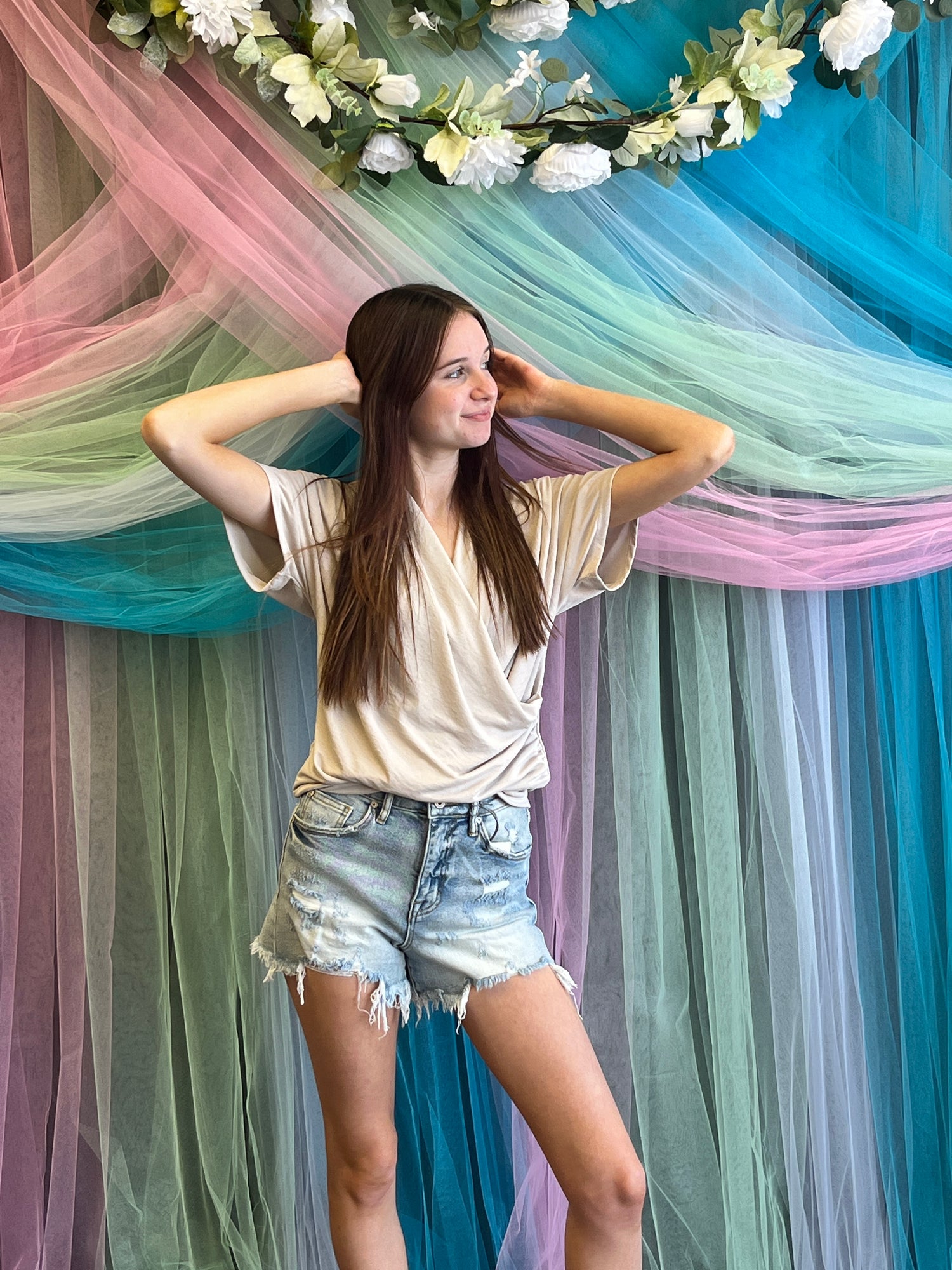 Stay chic and casual in the Your’s Truly Top in a soft, versatile beige hue. This lightweight wrap-style tee features a flattering V-neckline and relaxed short sleeves for a breezy, laid-back vibe. With a subtle drape and an easy silhouette, it’s the perfect everyday essential that balances comfort with understated elegance.